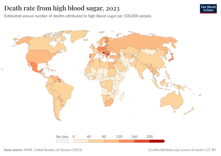 “Data Page: Death rate from high blood sugar”, part of the following publication: Esteban Ortiz-Ospina and Max Roser (2016) - “Global Health”. Data adapted from IHME, Global Burden of Disease. Retrieved from https://data-archive-fasttrack-step.owid.pages.dev:8789/20260213-112438/grapher/death-rates-from-high-blood-sugar-gbd.html [online resource] (archived on February 13, 2026).How to cite this data