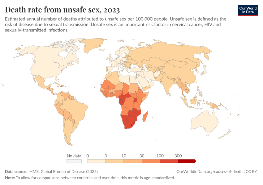 IHME, Global Burden of Disease (2025) – with major processing by Our World in Data. “Death rate from unsafe sex” [dataset]. IHME, Global Burden of Disease, “Global Burden of Disease - Risk Factors - Deaths” [original data]. Retrieved March 2, 2026 from https://data-archive-fasttrack-step.owid.pages.dev:8789/20260213-113303/grapher/death-rates-from-unsafe-sex.html (archived on February 13, 2026).