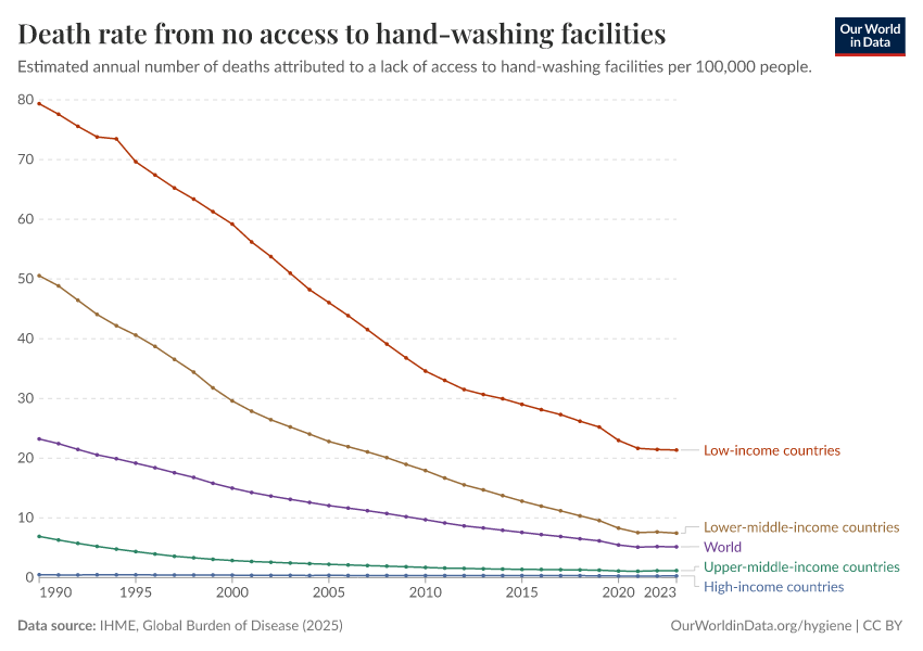 IHME, Global Burden of Disease (2025) – with major processing by Our World in Data. “Death rate from no access to hand-washing facilities” [dataset]. IHME, Global Burden of Disease, “Global Burden of Disease - Risk Factors - Deaths” [original data]. Retrieved March 2, 2026 from https://data-archive-fasttrack-step.owid.pages.dev:8789/20260213-112438/grapher/death-rates-no-handwashing.html (archived on February 13, 2026).