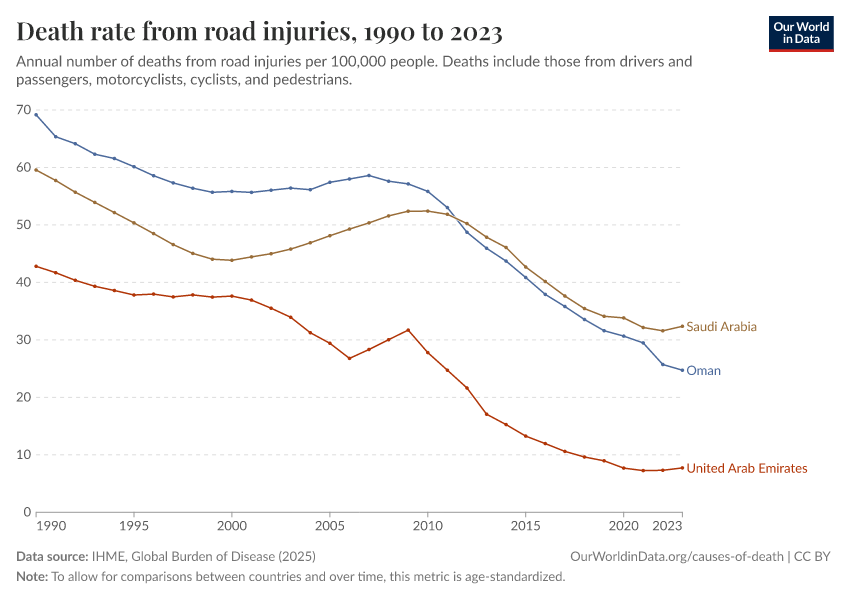 IHME, Global Burden of Disease (2025) – with major processing by Our World in Data. “Death rate from road injuries” [dataset]. IHME, Global Burden of Disease, “Global Burden of Disease - Deaths” [original data]. Retrieved March 2, 2026 from https://data-archive-fasttrack-step.owid.pages.dev:8789/20260211-173942/grapher/death-rates-road-incidents.html (archived on February 11, 2026).