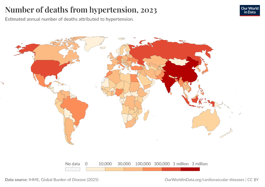 IHME, Global Burden of Disease (2025) – with major processing by Our World in Data. “Number of deaths from hypertension” [dataset]. IHME, Global Burden of Disease, “Global Burden of Disease - Risk Factors - Deaths” [original data]. Retrieved March 2, 2026 from https://data-archive-fasttrack-step.owid.pages.dev:8789/20260213-112438/grapher/deaths-due-to-high-blood-pressure.html (archived on February 13, 2026).