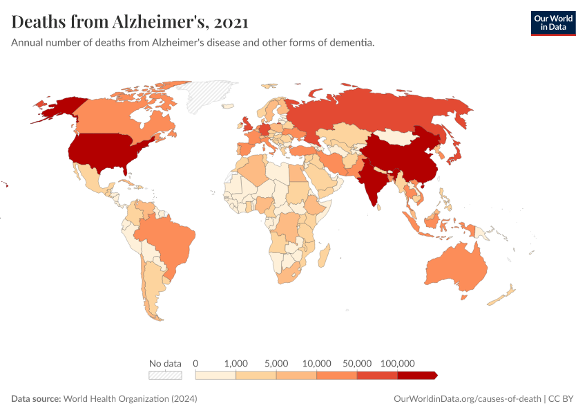 World Health Organization (2024) – with major processing by Our World in Data. “Deaths from Alzheimer's” [dataset]. World Health Organization, “Global Health Estimates” [original data]. Retrieved March 2, 2026 from https://data-archive-fasttrack-step.owid.pages.dev:8789/20250909-093708/grapher/deaths-from-alzheimers-other-dementias.html (archived on September 9, 2025).