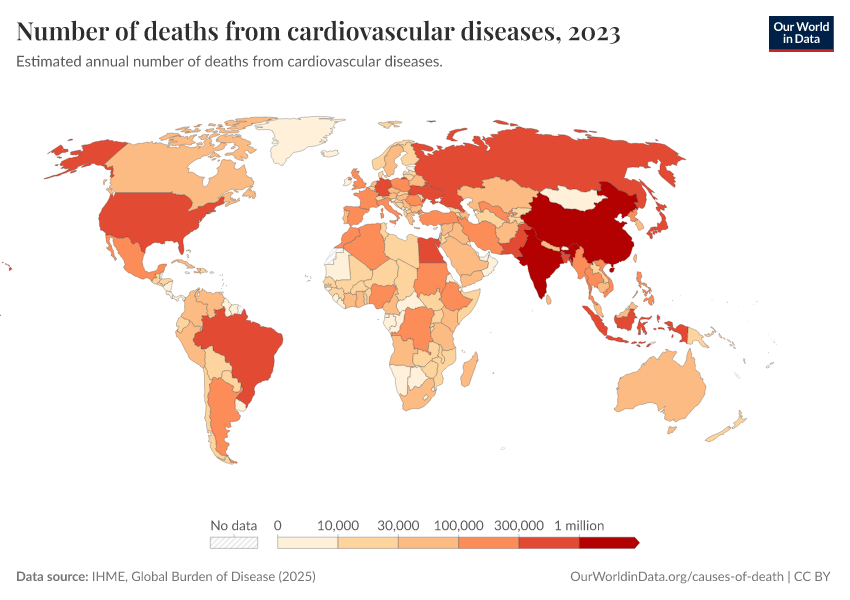 IHME, Global Burden of Disease (2025) – with major processing by Our World in Data. “Number of deaths from cardiovascular diseases” [dataset]. IHME, Global Burden of Disease, “Global Burden of Disease - Deaths” [original data]. Retrieved March 2, 2026 from https://data-archive-fasttrack-step.owid.pages.dev:8789/20260211-174736/grapher/deaths-from-cardiovascular-disease.html (archived on February 11, 2026).