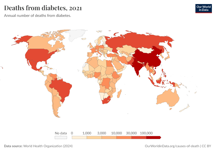 World Health Organization (2024) – with major processing by Our World in Data. “Deaths from diabetes” [dataset]. World Health Organization, “Global Health Estimates” [original data]. Retrieved March 2, 2026 from https://data-archive-fasttrack-step.owid.pages.dev:8789/20250909-093708/grapher/deaths-from-diabetes-ghe.html (archived on September 9, 2025).