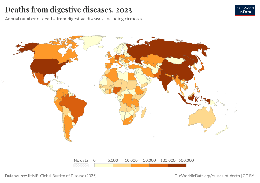 IHME, Global Burden of Disease (2025) – with major processing by Our World in Data. “Deaths from digestive diseases” [dataset]. IHME, Global Burden of Disease, “Global Burden of Disease - Deaths” [original data]. Retrieved March 2, 2026 from https://data-archive-fasttrack-step.owid.pages.dev:8789/20260211-174736/grapher/deaths-from-digestive-diseases.html (archived on February 11, 2026).