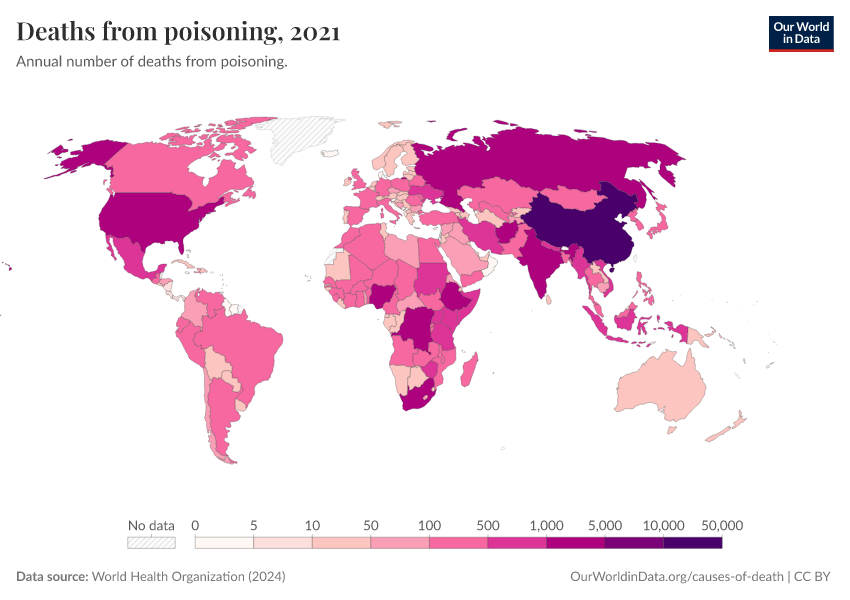 World Health Organization (2024) – with major processing by Our World in Data. “Deaths from poisoning” [dataset]. World Health Organization, “Global Health Estimates” [original data]. Retrieved March 2, 2026 from https://data-archive-fasttrack-step.owid.pages.dev:8789/20250909-093708/grapher/deaths-from-poisonings-ghe.html (archived on September 9, 2025).