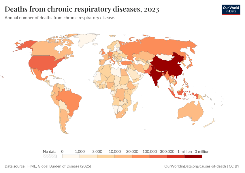 IHME, Global Burden of Disease (2025) – with major processing by Our World in Data. “Deaths from chronic respiratory diseases” [dataset]. IHME, Global Burden of Disease, “Global Burden of Disease - Deaths” [original data]. Retrieved March 2, 2026 from https://data-archive-fasttrack-step.owid.pages.dev:8789/20260211-174736/grapher/deaths-from-respiratory-disease.html (archived on February 11, 2026).