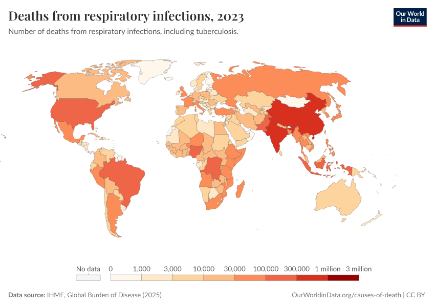 IHME, Global Burden of Disease (2025) – with major processing by Our World in Data. “Deaths from respiratory infections” [dataset]. IHME, Global Burden of Disease, “Global Burden of Disease - Deaths” [original data]. Retrieved March 2, 2026 from https://data-archive-fasttrack-step.owid.pages.dev:8789/20260211-174736/grapher/deaths-from-respiratory-infections.html (archived on February 11, 2026).