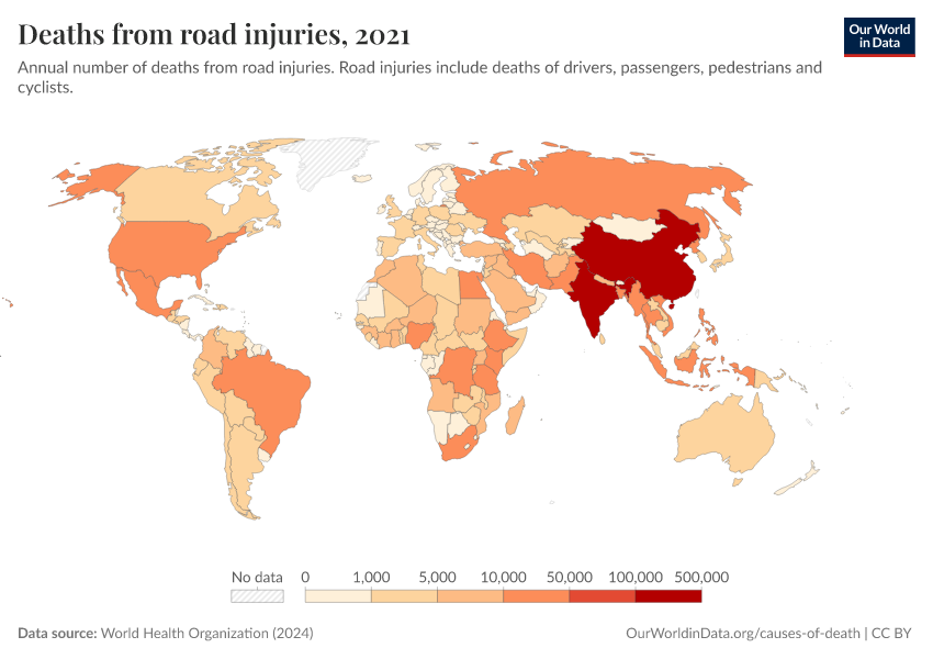 World Health Organization (2024) – with major processing by Our World in Data. “Deaths from road injuries” [dataset]. World Health Organization, “Global Health Estimates” [original data]. Retrieved March 2, 2026 from https://data-archive-fasttrack-step.owid.pages.dev:8789/20250909-093708/grapher/deaths-from-road-injuries.html (archived on September 9, 2025).