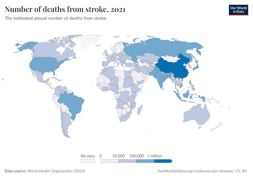 World Health Organization (2024) – with major processing by Our World in Data. “Number of deaths from stroke” [dataset]. World Health Organization, “Global Health Estimates” [original data]. Retrieved March 2, 2026 from https://data-archive-fasttrack-step.owid.pages.dev:8789/20250909-093708/grapher/deaths-from-strokes-ghe.html (archived on September 9, 2025).