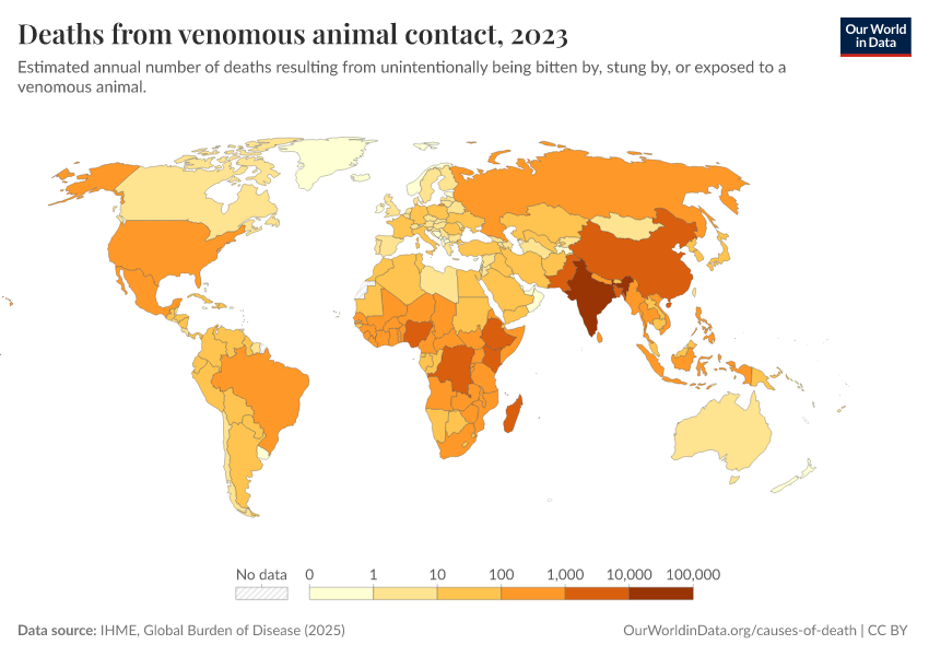 IHME, Global Burden of Disease (2025) – with major processing by Our World in Data. “Deaths from venomous animal contact” [dataset]. IHME, Global Burden of Disease, “Global Burden of Disease - Deaths” [original data]. Retrieved March 2, 2026 from https://data-archive-fasttrack-step.owid.pages.dev:8789/20260211-174736/grapher/deaths-from-venomous-animal-contact.html (archived on February 11, 2026).
