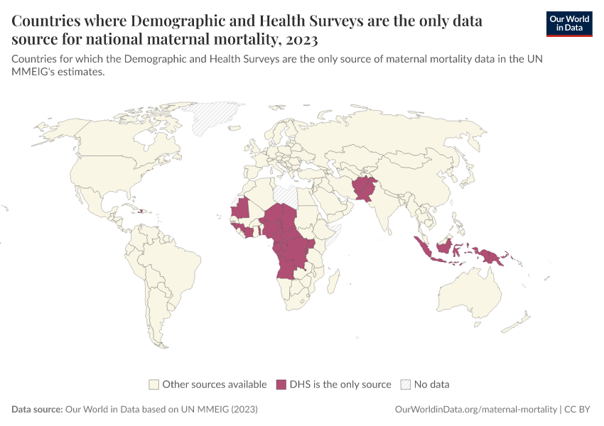 “Data Page: Countries where Demographic and Health Surveys are the only data source for national maternal mortality”. Our World in Data (2026). Data adapted from Our World in Data based on UN MMEIG. Retrieved from https://data-archive-fasttrack-step.owid.pages.dev:8789/20260224-141219/grapher/dhs-is-the-only-source-of-maternal-mortality-data.html [online resource] (archived on February 24, 2026).How to cite this data
