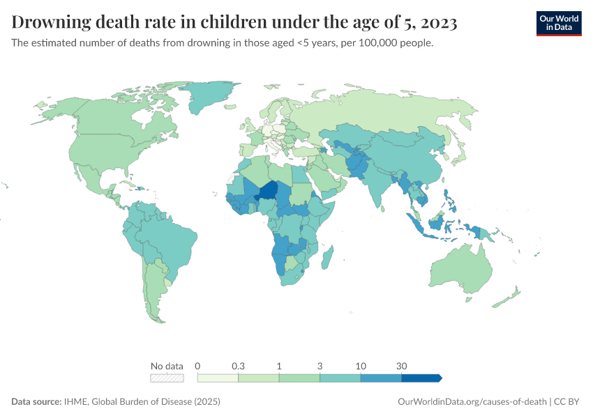 IHME, Global Burden of Disease (2025) – with major processing by Our World in Data. “Drowning death rate in children under the age of 5” [dataset]. IHME, Global Burden of Disease, “Global Burden of Disease - Deaths” [original data]. Retrieved March 2, 2026 from https://data-archive-fasttrack-step.owid.pages.dev:8789/20260211-174736/grapher/drowning-death-rates-under-5.html (archived on February 11, 2026).