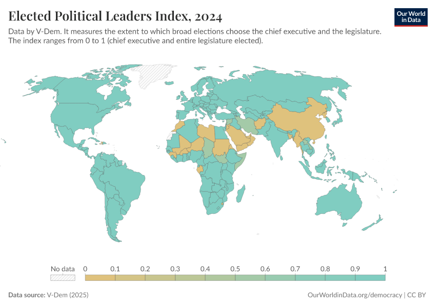 V-Dem (2025) – processed by Our World in Data. “Elected officials index” [dataset]. V-Dem, “Democracy report v15” [original data]. Retrieved March 2, 2026 from https://data-archive-fasttrack-step.owid.pages.dev:8789/20260119-070102/grapher/elected-political-leaders-index.html (archived on January 19, 2026).