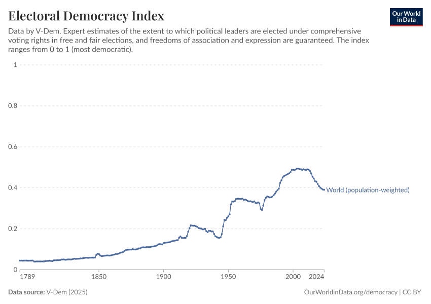 V-Dem (2025) – processed by Our World in Data. “Electoral democracy index – V-Dem” [dataset]. V-Dem, “Democracy report v15” [original data]. Retrieved March 2, 2026 from https://data-archive-fasttrack-step.owid.pages.dev:8789/20260119-070102/grapher/electoral-democracy-index.html (archived on January 19, 2026).