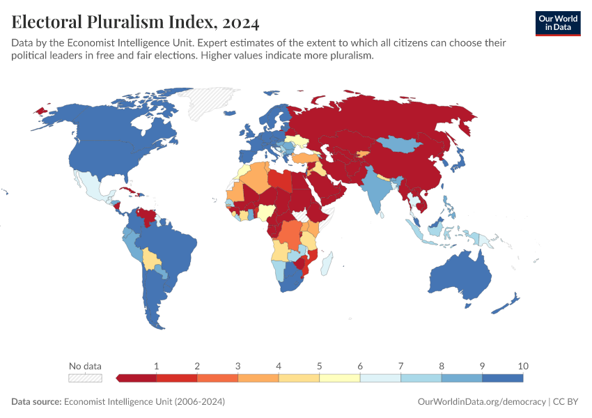 Economist Intelligence Unit (2006-2024) – processed by Our World in Data. “Electoral Pluralism Index” [dataset]. Economist Intelligence Unit, “Democracy Index 2021: The China challenge”; Economist Intelligence Unit, “Democracy Index 2022: Frontline democracy and the battle for Ukraine”; Economist Intelligence Unit, “Democracy Index 2023: Age of Conflict”; Economist Intelligence Unit, “Democracy Index 2024: What's wrong with representative democracy?”; Gapminder, “Democracy Index v4”; Various sources, “Population” [original data]. Retrieved March 2, 2026 from https://data-archive-fasttrack-step.owid.pages.dev:8789/20260119-070102/grapher/electoral-pluralism-index-eiu.html (archived on January 19, 2026).