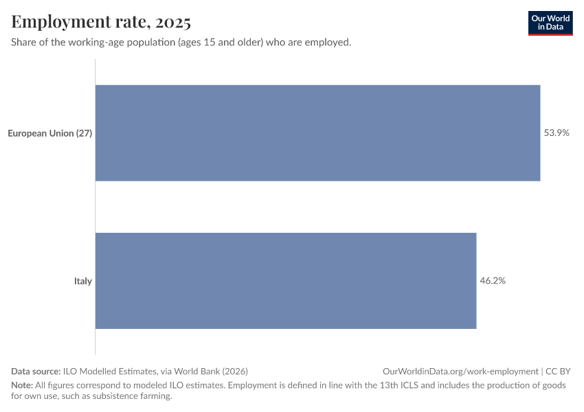 ILO Modelled Estimates, via World Bank (2026) – processed by Our World in Data. “Employment rate – ILO” [dataset]. ILO Modelled Estimates, via World Bank, “World Development Indicators 125” [original data]. Retrieved March 2, 2026 from https://data-archive-fasttrack-step.owid.pages.dev:8789/20260302-111553/grapher/employment-to-population-ratio.html (archived on March 2, 2026).