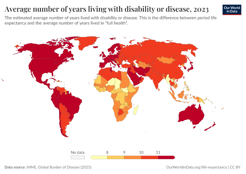 “Data Page: Average number of years living with disability or disease”, part of the following publication: Saloni Dattani, Lucas Rodés-Guirao, Hannah Ritchie, Esteban Ortiz-Ospina, and Max Roser (2023) - “Life Expectancy”. Data adapted from IHME, Global Burden of Disease. Retrieved from https://data-archive-fasttrack-step.owid.pages.dev:8789/20260213-171235/grapher/expected-years-of-living-with-disability-or-disease-burden.html [online resource] (archived on February 13, 2026).How to cite this data