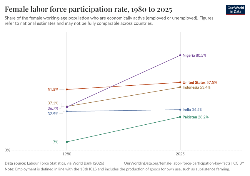 Labour Force Statistics, via World Bank (2026) – processed by Our World in Data. “Female labor force participation rate – ILO” [dataset]. Labour Force Statistics, via World Bank, “World Development Indicators 125” [original data]. Retrieved March 2, 2026 from https://data-archive-fasttrack-step.owid.pages.dev:8789/20260301-083443/grapher/female-labor-force-participation-rates-slopes.html (archived on March 1, 2026).