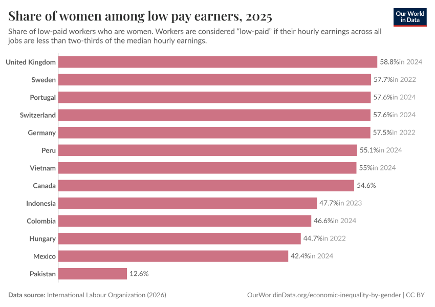 International Labour Organization (2026) – with minor processing by Our World in Data. “Share of women among low pay earners – ILO” [dataset]. International Labour Organization, “ILOSTAT” [original data]. Retrieved March 2, 2026 from https://data-archive-fasttrack-step.owid.pages.dev:8789/20260211-165747/grapher/female-share-of-low-pay-earners.html (archived on February 11, 2026).