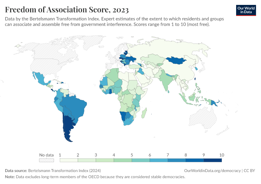 “Data Page: Freedom of Association Score”, part of the following publication: Bastian Herre, Lucas Rodés-Guirao, and Esteban Ortiz-Ospina (2013) - “Democracy”. Data adapted from Bertelsmann Transformation Index. Retrieved from https://data-archive-fasttrack-step.owid.pages.dev:8789/20260204-165456/grapher/freedom-of-association-score-bti.html [online resource] (archived on February 4, 2026).How to cite this data