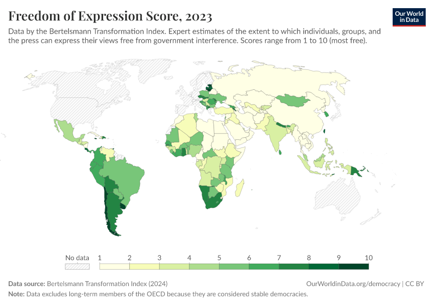 “Data Page: Freedom of Expression Score”, part of the following publication: Bastian Herre, Lucas Rodés-Guirao, and Esteban Ortiz-Ospina (2013) - “Democracy”. Data adapted from Bertelsmann Transformation Index. Retrieved from https://data-archive-fasttrack-step.owid.pages.dev:8789/20260204-165456/grapher/freedom-of-expression-score-bti.html [online resource] (archived on February 4, 2026).How to cite this data