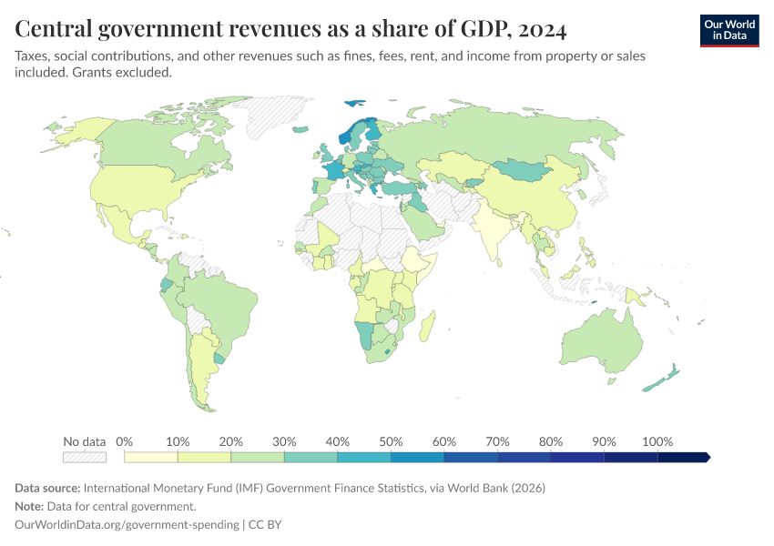 “Data Page: Central government revenues as a share of GDP”. Our World in Data (2026). Data adapted from International Monetary Fund (IMF) Government Finance Statistics, via World Bank. Retrieved from https://data-archive-fasttrack-step.owid.pages.dev:8789/20260301-083443/grapher/government-revenues-as-a-share-of-gdp-world-bank.html [online resource] (archived on March 1, 2026).How to cite this data