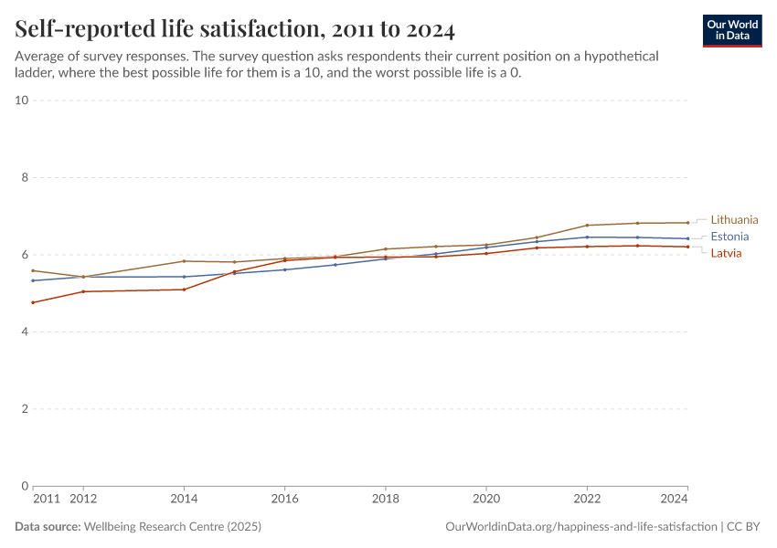 Wellbeing Research Centre (2025) – with major processing by Our World in Data. “Self-reported life satisfaction” [dataset]. Wellbeing Research Centre, “World Happiness Report 2025” [original data]. Retrieved March 2, 2026 from https://data-archive-fasttrack-step.owid.pages.dev:8789/20260119-065148/grapher/happiness-cantril-ladder.html (archived on January 19, 2026).