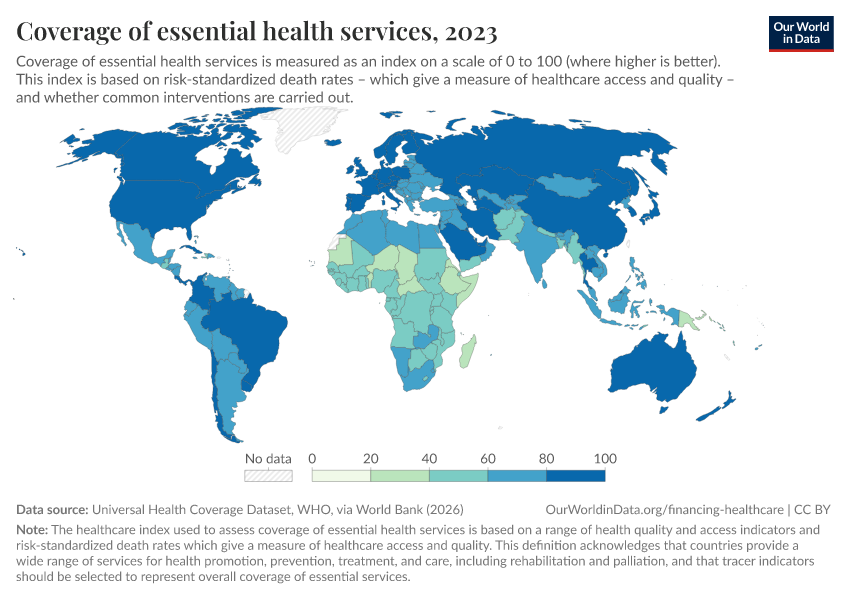 “Data Page: Coverage of essential health services”. Our World in Data (2026). Data adapted from Universal Health Coverage Dataset, WHO, via World Bank. Retrieved from https://data-archive-fasttrack-step.owid.pages.dev:8789/20260301-083443/grapher/healthcare-access-quality-un.html [online resource] (archived on March 1, 2026).How to cite this data