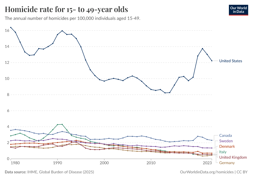 IHME, Global Burden of Disease (2025) – with major processing by Our World in Data. “Homicide rate for 15- to 49-year olds” [dataset]. IHME, Global Burden of Disease, “Global Burden of Disease - Deaths” [original data]. Retrieved March 2, 2026 from https://data-archive-fasttrack-step.owid.pages.dev:8789/20260211-174736/grapher/homicide-rate-in-15--to-49-year-olds.html (archived on February 11, 2026).