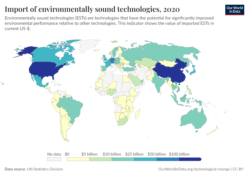 UN Statistics Division – processed by Our World in Data. “Import of environmentally sound technologies” [dataset]. UN Statistics Division, “WESR / UN COMTRADE” [original data]. Retrieved March 2, 2026 from https://data-archive-fasttrack-step.owid.pages.dev:8789/20260130-180113/grapher/import-of-environmentally-sound-technologies.html (archived on January 30, 2026).