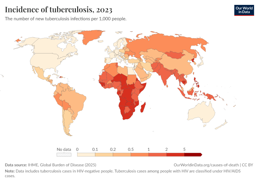 IHME, Global Burden of Disease (2025) – with major processing by Our World in Data. “Incidence of tuberculosis” [dataset]. IHME, Global Burden of Disease, “Global Burden of Disease - Prevalence and Incidence” [original data]. Retrieved March 2, 2026 from https://data-archive-fasttrack-step.owid.pages.dev:8789/20260212-172859/grapher/incidence-of-tuberculosis.html (archived on February 12, 2026).