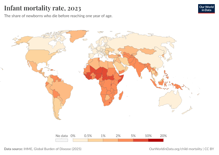 IHME, Global Burden of Disease (2025) – with minor processing by Our World in Data. “Infant mortality rate” [dataset]. IHME, Global Burden of Disease, “Global Burden of Disease - Child Mortality” [original data]. Retrieved March 2, 2026 from https://data-archive-fasttrack-step.owid.pages.dev:8789/20260213-140117/grapher/infant-mortality-rate.html (archived on February 13, 2026).