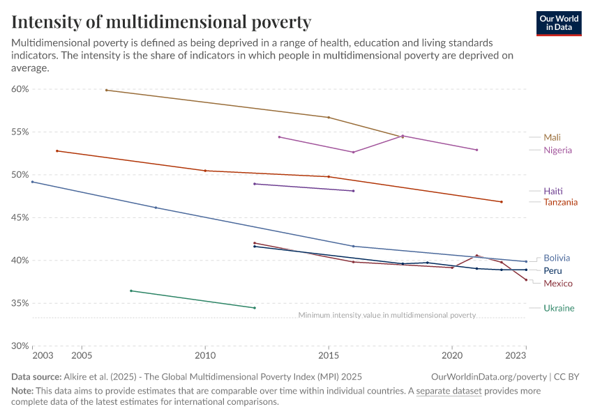 Alkire et al. (2025) - The Global Multidimensional Poverty Index (MPI) 2025 – with minor processing by Our World in Data. “Intensity of multidimensional poverty – Harmonized over time” [dataset]. Alkire et al., “Global Multidimensional Poverty Index (MPI) 2025” [original data]. Retrieved March 2, 2026 from https://data-archive-fasttrack-step.owid.pages.dev:8789/20251229-175603/grapher/intensity-of-multidimensional-poverty-hot.html (archived on December 29, 2025).
