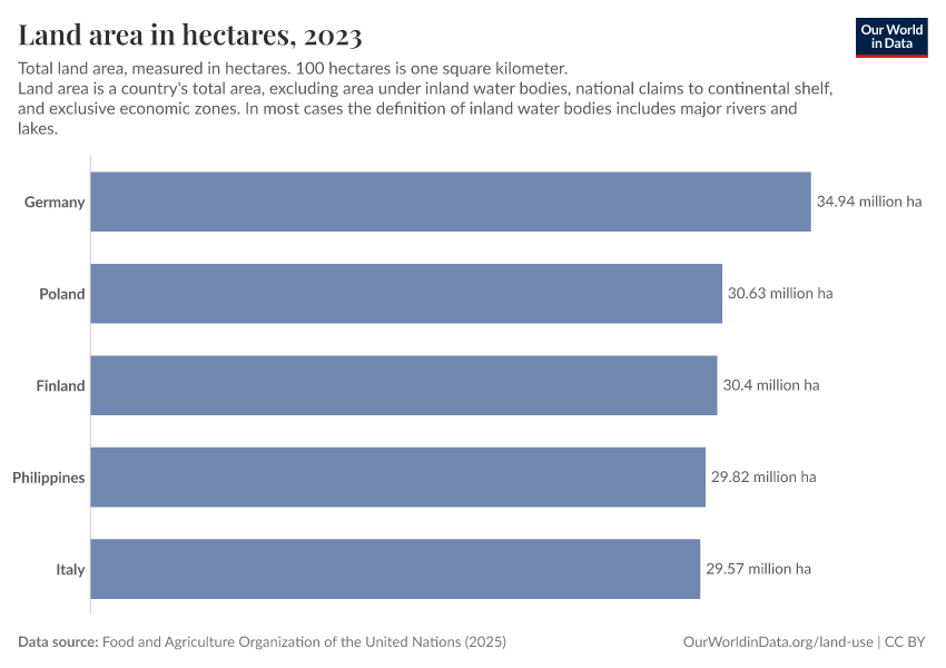 “Data Page: Land area in hectares”, part of the following publication: Hannah Ritchie, Pablo Rosado, and Max Roser (2023) - “Agricultural Production”. Data adapted from Food and Agriculture Organization of the United Nations. Retrieved from https://data-archive-fasttrack-step.owid.pages.dev:8789/20260226-122020/grapher/land-area-hectares.html [online resource] (archived on February 26, 2026).How to cite this data