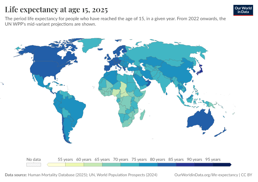 Human Mortality Database (2025); UN, World Population Prospects (2024) – with major processing by Our World in Data. “Life expectancy at 15 – HMD, UN WPP – period tables, with UN medium projections” [dataset]. Human Mortality Database, “Human Mortality Database”; United Nations, “World Population Prospects” [original data]. Retrieved March 2, 2026 from https://data-archive-fasttrack-step.owid.pages.dev:8789/20260225-014904/grapher/life-expectancy-at-age-15.html (archived on February 25, 2026).