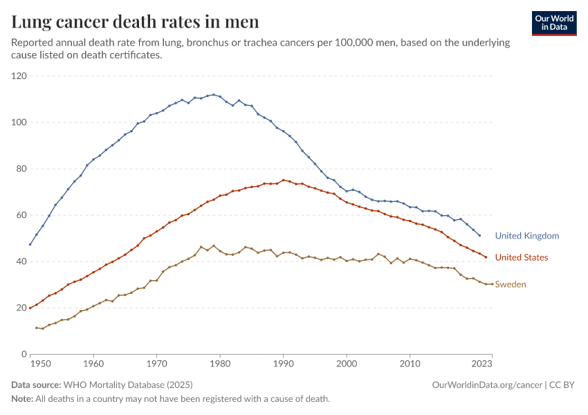 “Data Page: Lung cancer death rates in men”, part of the following publication: Saloni Dattani, Fiona Spooner, Hannah Ritchie, and Max Roser (2023) - “Causes of Death”. Data adapted from WHO Mortality Database. Retrieved from https://data-archive-fasttrack-step.owid.pages.dev:8789/20250909-093708/grapher/lung-cancer-death-rates-males.html [online resource] (archived on September 9, 2025).How to cite this data
