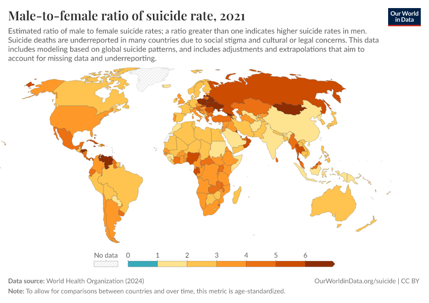 World Health Organization (2024) – with major processing by Our World in Data. “Male-to-female ratio of suicide rate” [dataset]. World Health Organization, “Global Health Estimates” [original data]. Retrieved March 2, 2026 from https://data-archive-fasttrack-step.owid.pages.dev:8789/20250909-093708/grapher/male-female-ratio-suicides-rates.html (archived on September 9, 2025).