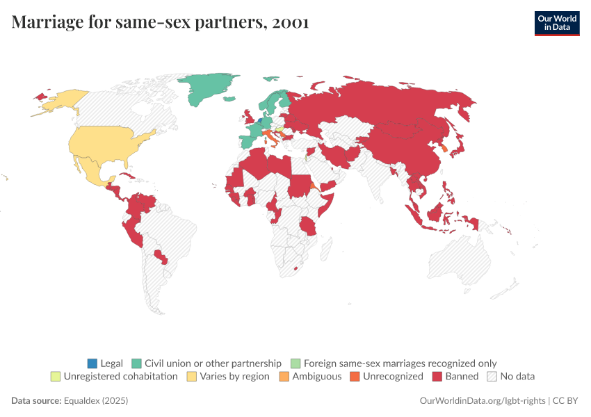Equaldex (2025) – with major processing by Our World in Data. “Marriage for same-sex partners” [dataset]. Equaldex, “Equaldex” [original data]. Retrieved March 2, 2026 from https://data-archive-fasttrack-step.owid.pages.dev:8789/20250909-093708/grapher/marriage-same-sex-partners-equaldex.html (archived on September 9, 2025).