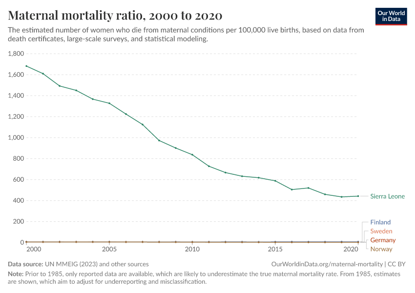 “Data Page: Maternal mortality ratio”, part of the following publication: Max Roser and Hannah Ritchie (2013) - “Maternal Mortality”. Data adapted from UN MMEIG (WHO, UNICEF, UNFPA, World Bank Group and UNDESA/ Population Division), WHO Mortality Database, United Nations, Gapminder. Retrieved from https://data-archive-fasttrack-step.owid.pages.dev:8789/20260119-065148/grapher/maternal-mortality.html [online resource] (archived on January 19, 2026).