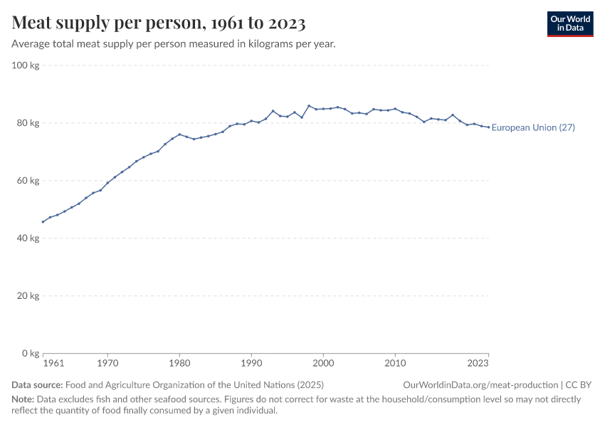 “Data Page: Yearly per capita supply of all meat”. Our World in Data (2026). Data adapted from Food and Agriculture Organization of the United Nations. Retrieved from https://data-archive-fasttrack-step.owid.pages.dev:8789/20260301-071607/grapher/meat-supply-per-person.html [online resource] (archived on March 1, 2026).How to cite this data