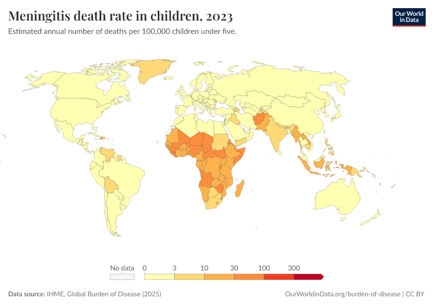 “Data Page: Meningitis death rate in children”, part of the following publication: Esteban Ortiz-Ospina and Max Roser (2016) - “Global Health”. Data adapted from IHME, Global Burden of Disease. Retrieved from https://data-archive-fasttrack-step.owid.pages.dev:8789/20260211-174736/grapher/meningitis-death-rates-children-under-5.html [online resource] (archived on February 11, 2026).How to cite this data