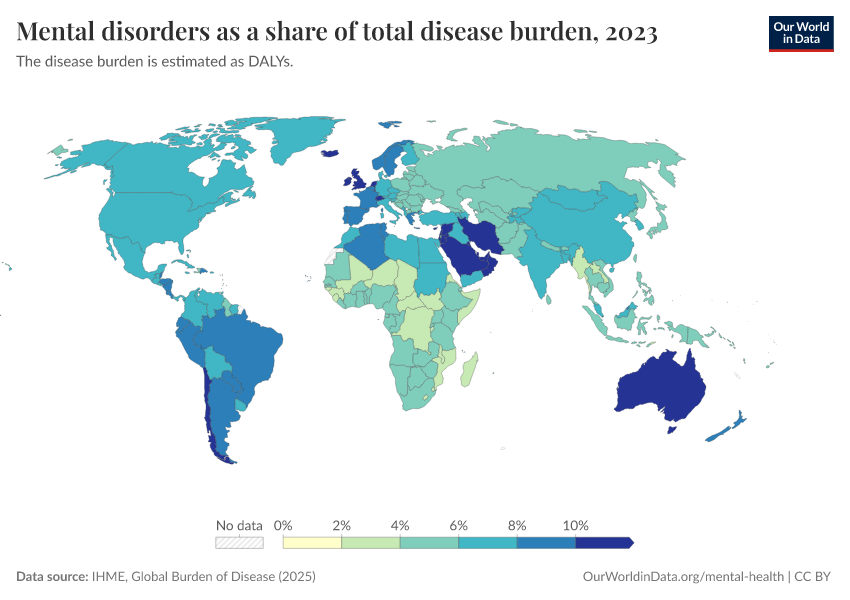 IHME, Global Burden of Disease (2025) – with major processing by Our World in Data. “Mental disorders as a share of total disease burden” [dataset]. IHME, Global Burden of Disease, “Global Burden of Disease - DALYs” [original data]. Retrieved March 2, 2026 from https://data-archive-fasttrack-step.owid.pages.dev:8789/20260211-174736/grapher/mental-and-substance-use-as-share-of-disease.html (archived on February 11, 2026).