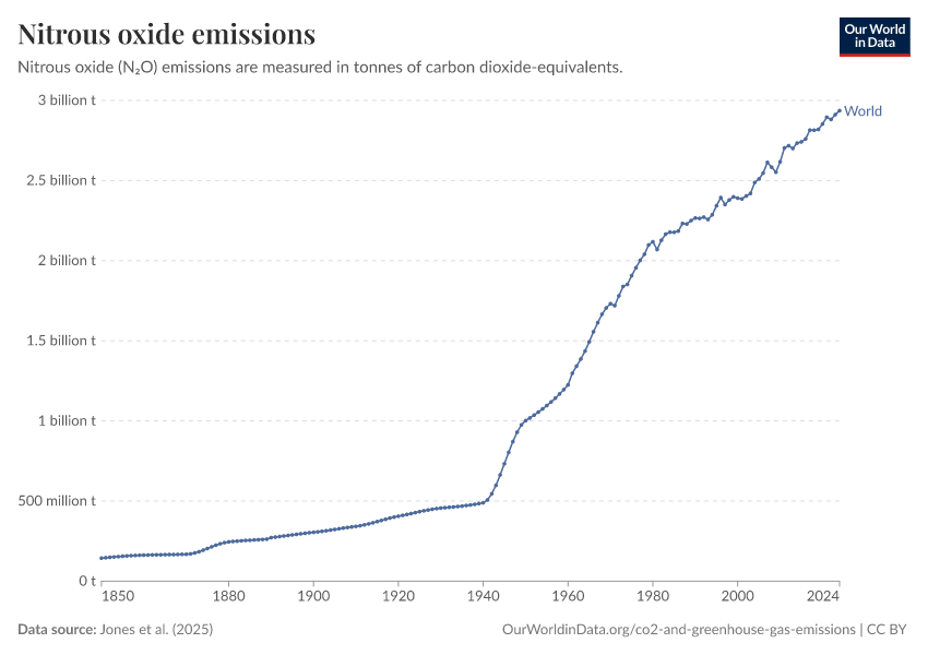 “Data Page: Annual nitrous oxide emissions including land use”, part of the following publication: Hannah Ritchie, Pablo Rosado, and Max Roser (2023) - “CO₂ and Greenhouse Gas Emissions”. Data adapted from Jones et al.. Retrieved from https://data-archive-fasttrack-step.owid.pages.dev:8789/20260223-070107/grapher/nitrous-oxide-emissions.html [online resource] (archived on February 23, 2026).How to cite this data