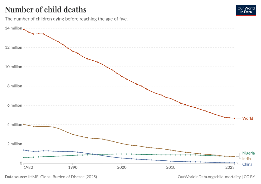 IHME, Global Burden of Disease (2025) – with major processing by Our World in Data. “Number of child deaths” [dataset]. IHME, Global Burden of Disease, “Global Burden of Disease - Deaths” [original data]. Retrieved March 2, 2026 from https://data-archive-fasttrack-step.owid.pages.dev:8789/20260211-174736/grapher/number-of-child-deaths.html (archived on February 11, 2026).