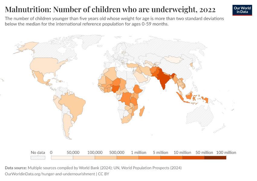 “Data Page: Number of underweight children”. Our World in Data (2026). Data adapted from UNICEF, WHO, World Bank, United Nations. Retrieved from https://data-archive-fasttrack-step.owid.pages.dev:8789/20260119-070102/grapher/number-of-children-who-are-underweight.html [online resource] (archived on January 19, 2026).How to cite this data