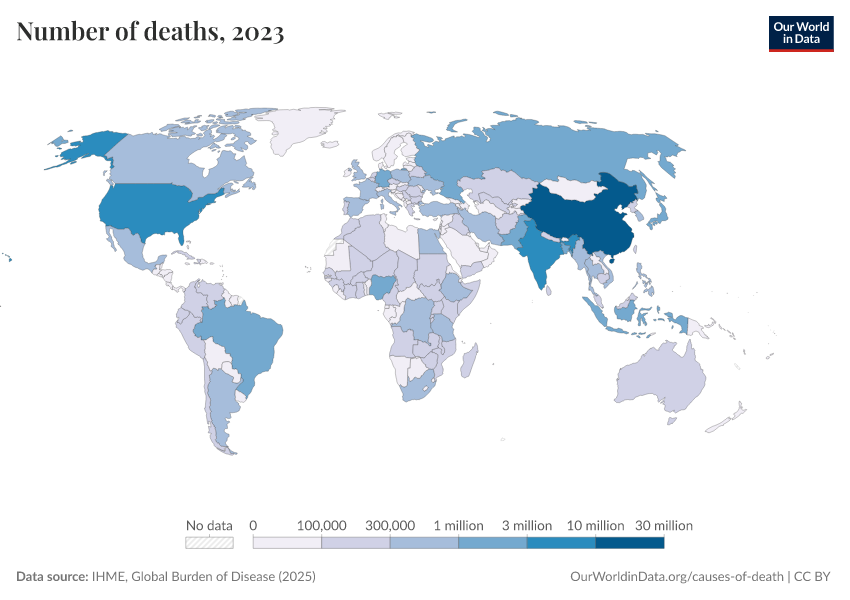 “Data Page: Number of deaths”, part of the following publication: Esteban Ortiz-Ospina and Max Roser (2016) - “Global Health”. Data adapted from IHME, Global Burden of Disease. Retrieved from https://data-archive-fasttrack-step.owid.pages.dev:8789/20260211-174736/grapher/number-of-deaths-gbd.html [online resource] (archived on February 11, 2026).How to cite this data