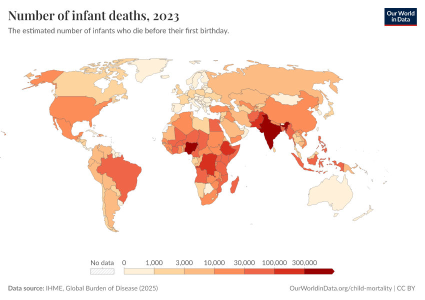 IHME, Global Burden of Disease (2025) – with minor processing by Our World in Data. “Number of infant deaths” [dataset]. IHME, Global Burden of Disease, “Global Burden of Disease - Child Mortality” [original data]. Retrieved March 2, 2026 from https://data-archive-fasttrack-step.owid.pages.dev:8789/20260213-140117/grapher/number-of-infant-deaths-ihme.html (archived on February 13, 2026).