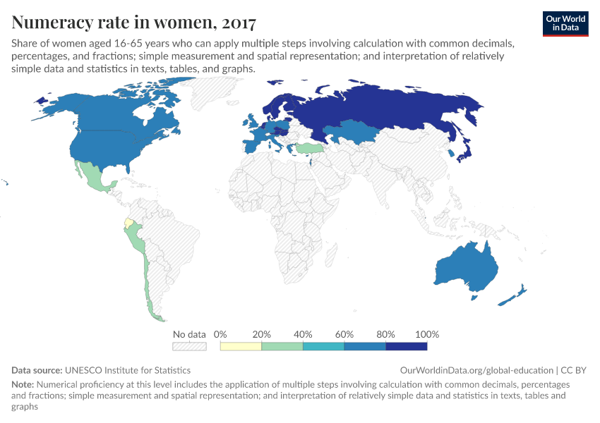 “Data Page: Numeracy rate in women”. Our World in Data (2026). Data adapted from UNESCO Institute for Statistics. Retrieved from https://data-archive-fasttrack-step.owid.pages.dev:8789/20260105-133053/grapher/numeracy-rate-in-adult-women-sdg.html [online resource] (archived on January 5, 2026).How to cite this data