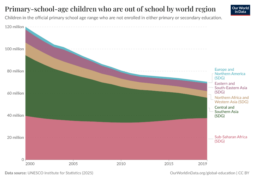 “Data Page: Out-of-school children of primary school age”, part of the following publication: Hannah Ritchie, Veronika Samborska, Esteban Ortiz-Ospina, and Max Roser (2023) - “Global Education”. Data adapted from UNESCO Institute for Statistics. Retrieved from https://data-archive-fasttrack-step.owid.pages.dev:8789/20260122-091445/grapher/out-of-school-children-of-primary-school-age-by-world-region.html [online resource] (archived on January 22, 2026).How to cite this data